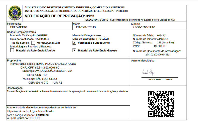 o Etilômetro, ou bafômetro serie 093475, utilizado pela GCM de São Leopoldo RS foi reprovado pelo Inmetro.